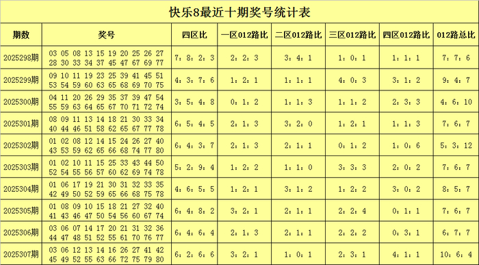 福彩快乐8第2025307期开奖回顾:03 06 12 13 14 16 26 27 41 42 45 49 52 55 63 66 72 75 79 80,其中奖号四区比为6:2:6:6,012路比为10:6:4,和值为836,跨度为77。