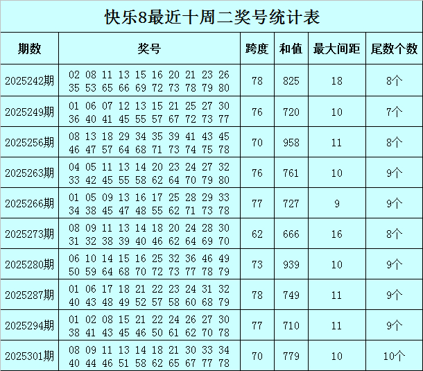 福彩快乐8第2025301期(上周二)回顾:08 09 11 13 14 18 21 30 33 34 40 44 46 51 58 62 65 67 77 78,其中奖号首尾间距为70,和值为779,最大间距为10,尾数分布为:尾数2、5、6、9包含1个号码,尾数0、3、7包含2个号码,尾数1、4包含3个号码,尾数8包含4个号码。